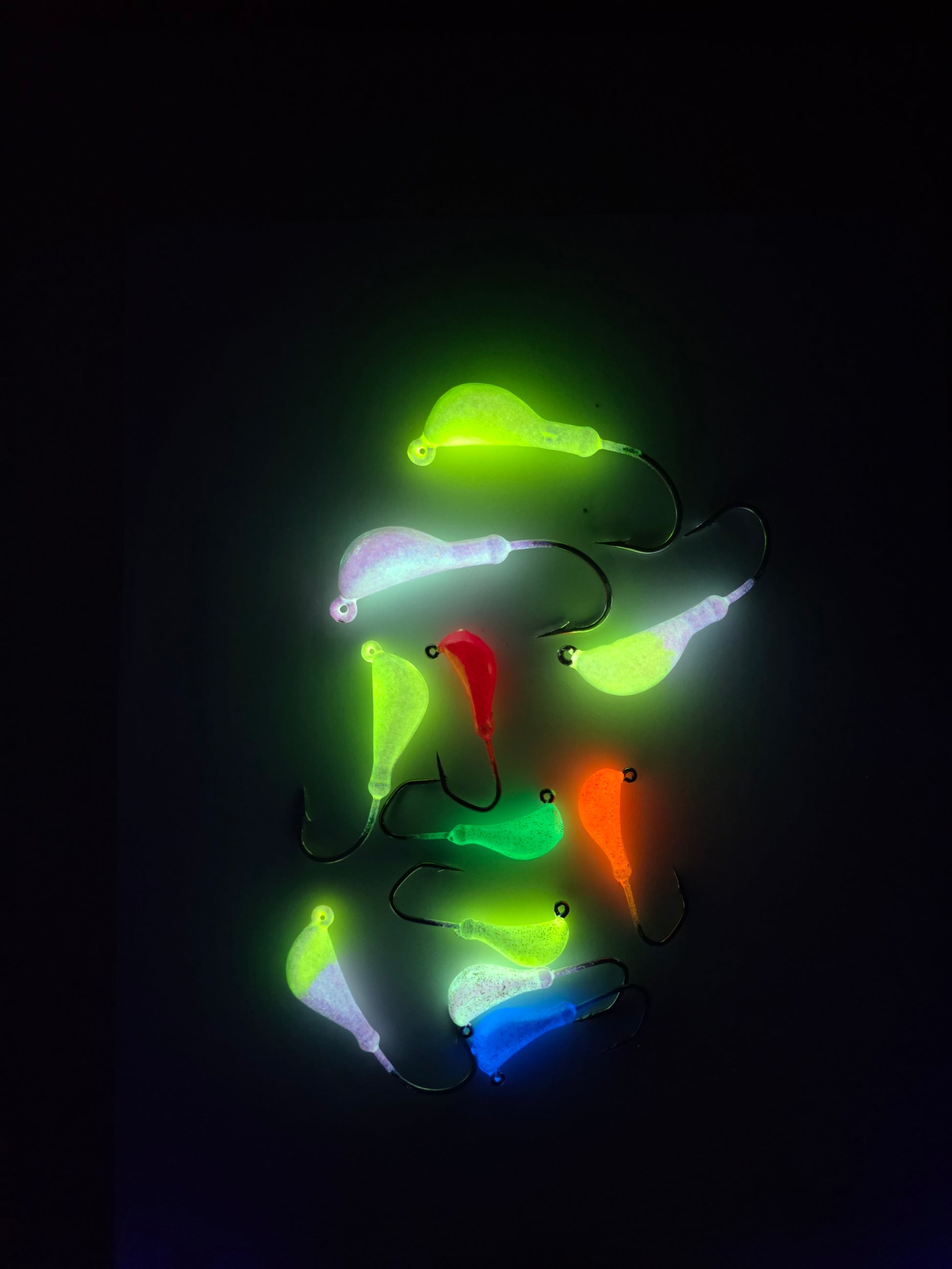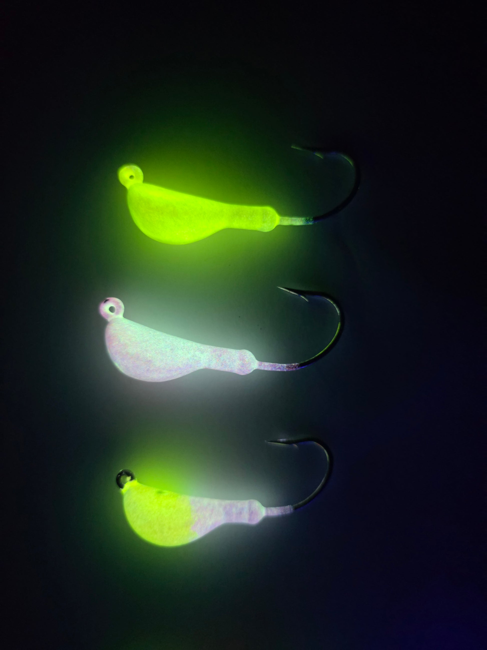 Exile Bait & Tackle Co is Excited to offer A tried, tested, and true winner of a Jig. Offered in sizes from 1/2 Oz up to 2 Oz in a variety of Hypno-Glo colors. These Nanner heads are manufactured with high Quality 413 heavy Eagle Claw salt water hooks and a super durable in house made Hypno-Glo powder coat that's sure to take a beating pounding on rock bottoms stirring up hungry Burbot, Lakers, Walley ect.